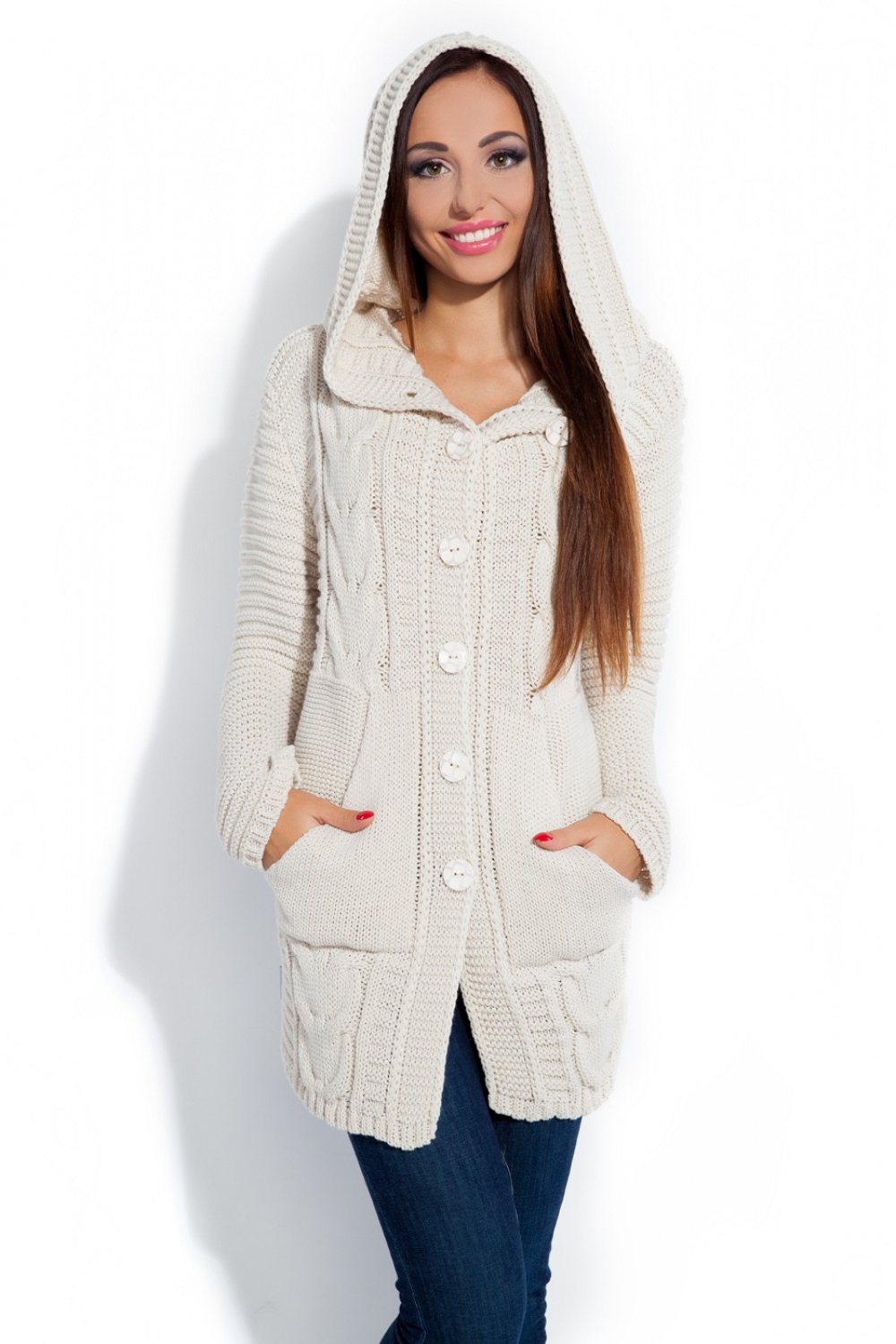 Długi, gruby kardigan z warkoczami i kapturem. Zapinany na guziki, klasyczny model z kieszeniami powinien znaleźć się w szafie każdej kobiety.