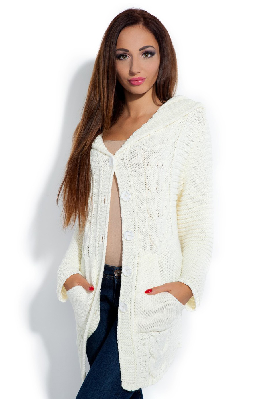 Długi, gruby kardigan z warkoczami i kapturem. Zapinany na guziki, klasyczny model z kieszeniami powinien znaleźć się w szafie każdej kobiety.