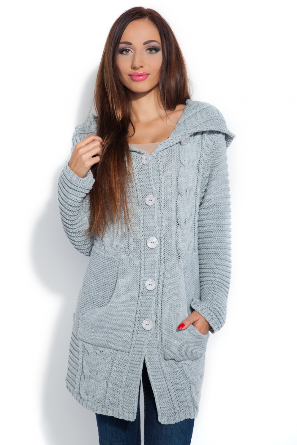 Długi, gruby kardigan z warkoczami i kapturem. Zapinany na guziki, klasyczny model z kieszeniami powinien znaleźć się w szafie każdej kobiety.