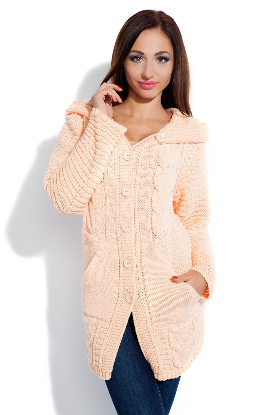 Długi, gruby kardigan z warkoczami i kapturem. Zapinany na guziki, klasyczny model z kieszeniami powinien znaleźć się w szafie każdej kobiety.