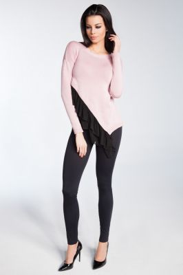 Asymetryczny kobiecy sweter z dekoltem typu łódka i doszytą czarną podwójną falbanką z cieniutkiego, zwiewnego tiulu. Styl klasyczny połączony z romantycznymi elementami to absolutna nowość, sprawi że będziesz wyglądać ponętnie i kobieco.