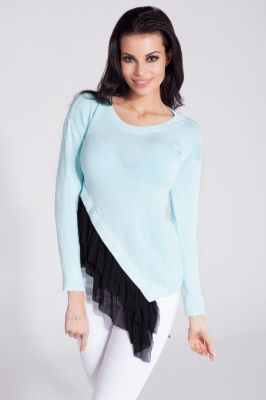 Asymetryczny kobiecy sweter z dekoltem typu łódka i doszytą czarną podwójną falbanką z cieniutkiego, zwiewnego tiulu. Styl klasyczny połączony z romantycznymi elementami to absolutna nowość, sprawi że będziesz wyglądać ponętnie i kobieco.