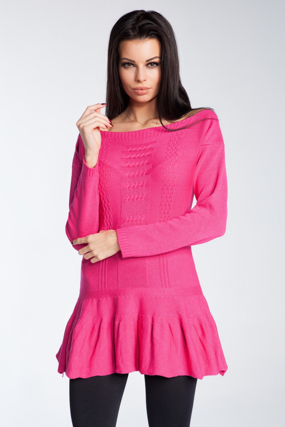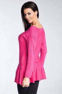 Sweter damski z długim rękawem. Dekolt w łódkę, z fantazyjną falbanką u dołu.