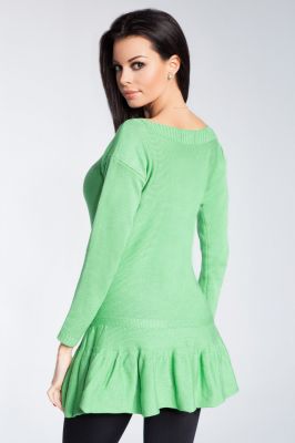 Sweter damski z długim rękawem. Dekolt w łódkę, z fantazyjną falbanką u dołu.