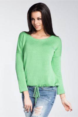 Lekki sweter damski z długim rękawem z dekoltem w łódkę. U dołu regulacja obwodu za pomocą sznureczka.