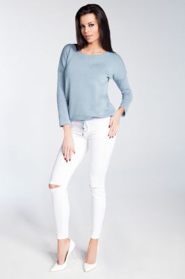 Lekki sweter damski z długim rękawem z dekoltem w łódkę. U dołu regulacja obwodu za pomocą sznureczka.