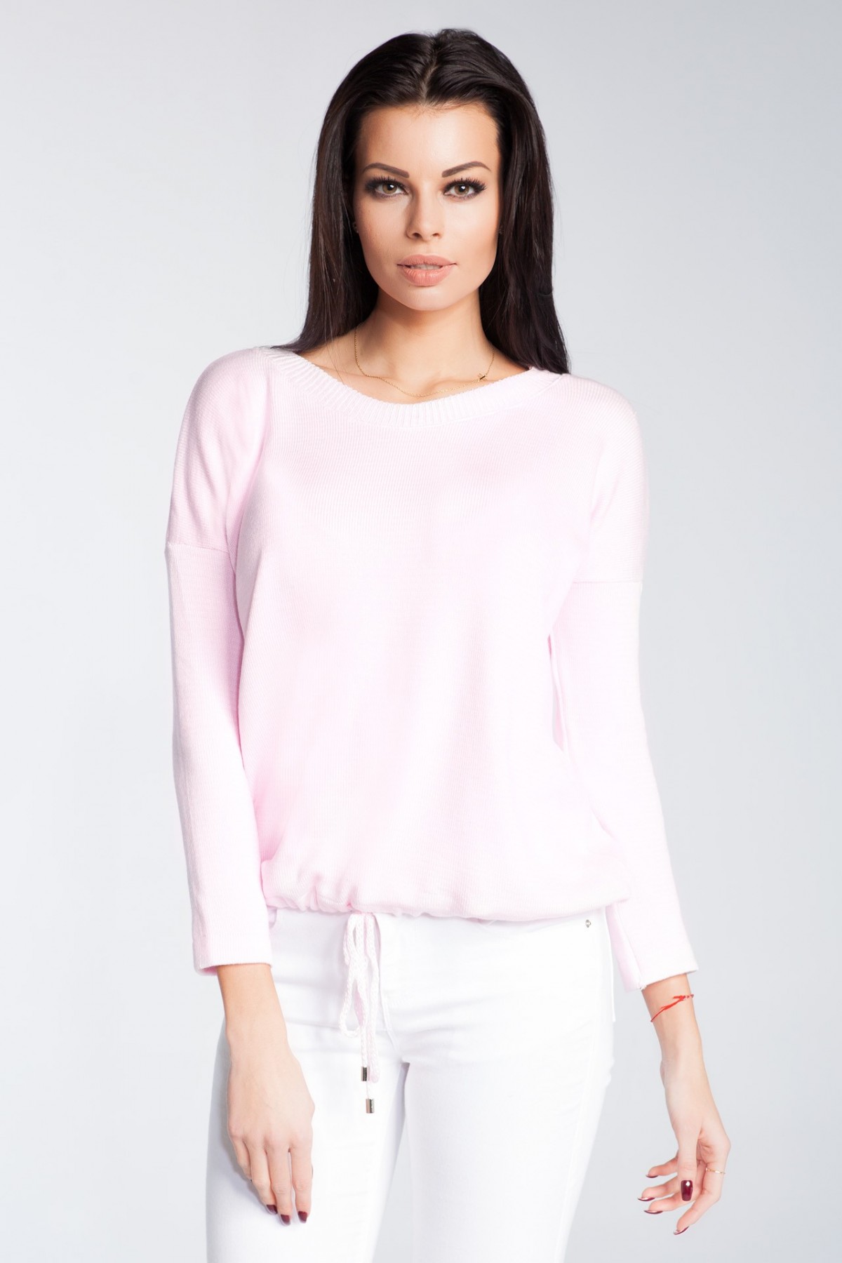 Lekki sweter damski z długim rękawem z dekoltem w łódkę. U dołu regulacja obwodu za pomocą sznureczka.