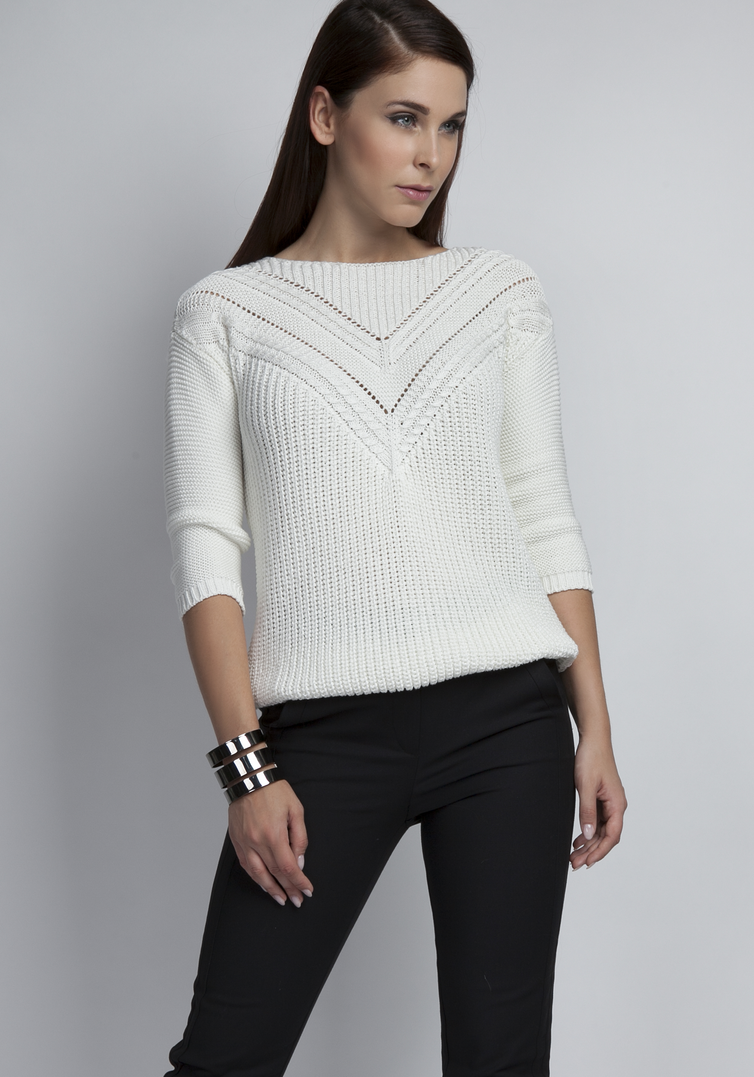 Jeśli wydaje ci się, że każdy sweter dodaje kilogramów, to koniecznie sprawdź ten model. Ażurowa wstawka na biuście nie znalazła się tutaj przez przypadek. Jej głównym zadaniem jest optyczne wymodelowanie sylwetki poprzez podkreślenie linii dekoltu, zaakcentowanie talii i zrównoważenie bioder. Dekolt w łódkę oraz rękaw 3/4 to ukłon w stronę modnych, pożądanych obecnie rozwiązań. Doskonała propozycja na chłodne jesienno-zimowe dni i wieczory. Dzianina mięciutka i elastyczna, zdecydowanie można się w niej zakochać.