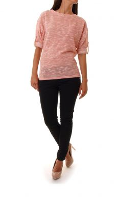 Śliczny bawełniany sweterek przeszywany mieniącą nitką. Bluzka z długim rękawem z możliwością podwinięcia do długości 3/4. Sweter zapinany jest z tyłu na zamek. Z przodu na lewej piersi kieszonka. Wykonany z przyjemnej w dotyku dzianiny. Miękka narzutka z delikatnie dłuższym tyłem. Stylowy nietoperz / kimono.Skład: 65% bawełna, 35% poliester