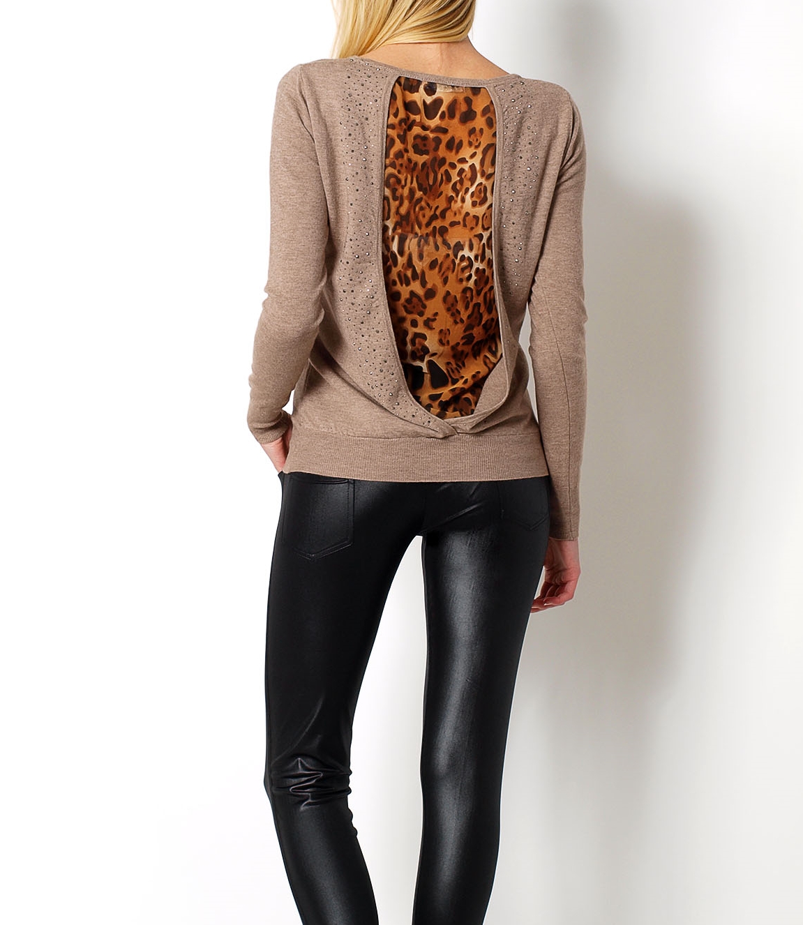 Sweter, rozcięcie na plecach zdobione dżetami, z tyłu szyfonowa wstawka na plecach - motyw panterki, dekolt okrągły, dół i rękawy wykończone ściągaczami.Materiał 65% bawełna, 35%poliester.Modelka wzrost 175cm, na co dzień nosi S/M, rozmiar z prezentacji produktu S/XL (uniwersalny)