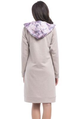 Ciepły i przyjemny w dotyku szlafrok wykonany z miękkiej dzianiny. Przód oraz kaptur wykonany jest z materiału w piękne kwiaty. Komfortowy fason z kapturem, kieszeniami po bokach oraz zapięciem na zamek z przodu. Rękaw długi. Dół oraz wykończone ściągaczem. Idealna propozycja na jesień i zimę.