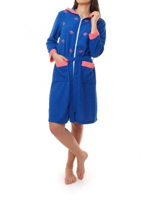 Praktyczny szlafrok z kapturem, zapinany z przodu na zamek i dodatkowo wiązany w pasie grubym sznureczkiem. Z przodu dwie duże kieszenie. Zdobiony delikatnymi motylkami. Posiada ciekawe, kontrastowe wstawki przy kapturze, kieszeniach i na dole rękawów. Bardzo przyjemna i miła w dotyku podomka.Skład: 65% bawełna, 35% poliester