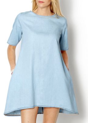 Trapezowa sukienka, luźniejszy fason, lekki jeans, jasny odcień, dekolt okrągły, krótki rękaw, po bokach kieszenie, tył lekko dłuższy, z tyłu jeansowa wstążka do zawiązania kokardy. Materiał 100% bawełnaModelka wzrost 175cm, na co dzień nosi S/M, rozmiar z prezentacji produktu S/M