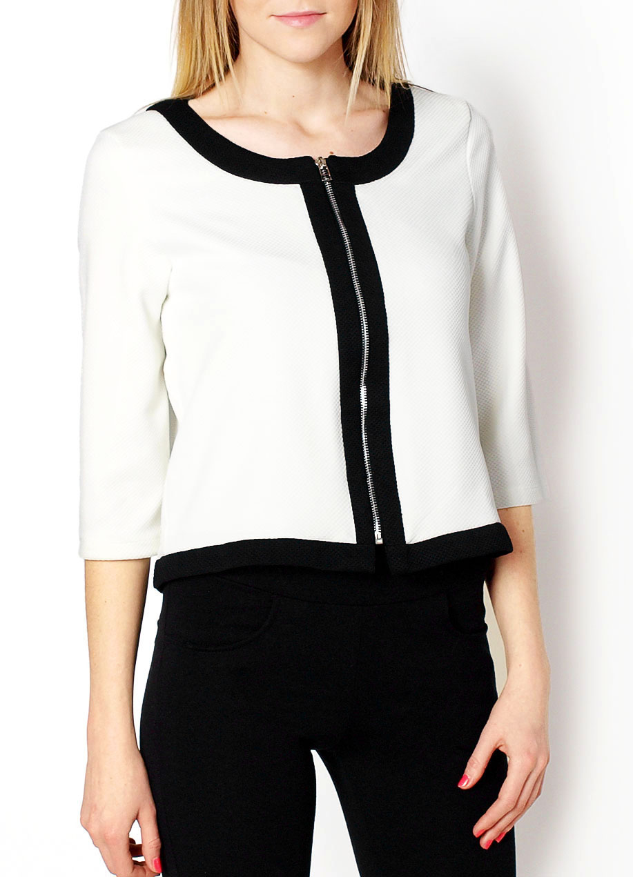 Narzutka zapinana na suwak. Rękawy 3/4 dekolt okrągły. Faktura materiału lekko pikowana.Materiał: 35% bawełna, 65% poliester.Modelka: wzrost 175 cm, na co dzień nosi S/M, rozmiar z prezentacji produktu M.