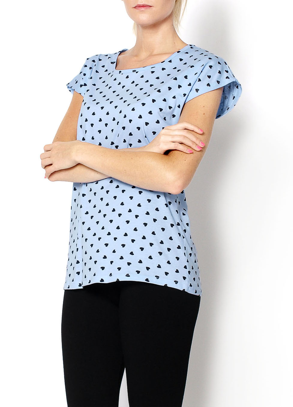 Koszulka z krótkim rękawem z wzorem w serduszka. Dekolt okrągły.Modelka: wzrost 175 cm, na co dzień nosi S/M, rozmiar z prezentacji produktu S.