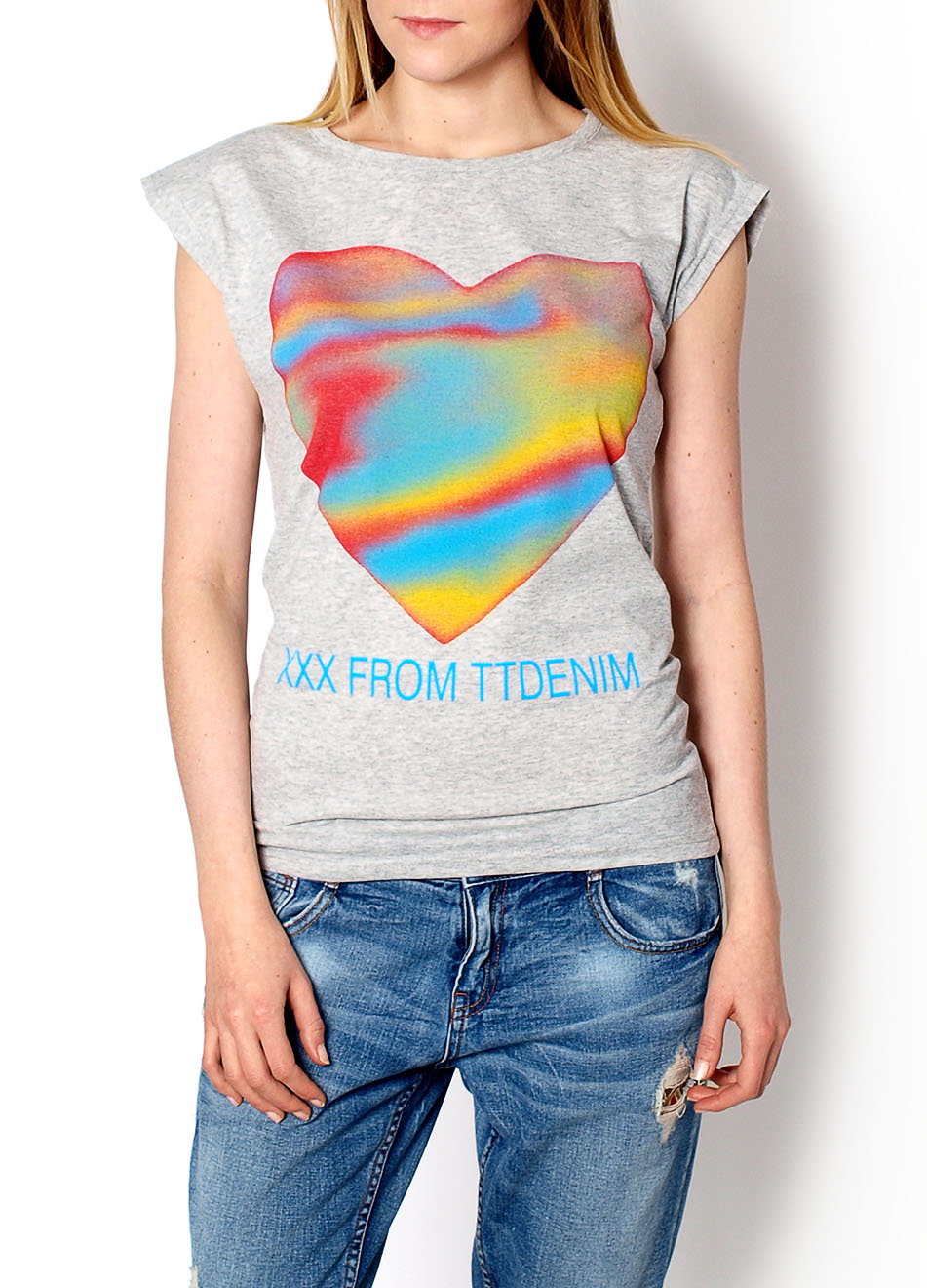 Bluzka z modnym nadrukiem w kształcie serca. Posiada okrągły dekolt. Wykonana z lekkiej, oddychającej bawełny. Idealna do jeansów, letnich szortów czy spódniczek.Materiał 100% bawełnaModelka wzrost 175cm, na co dzień nosi S/M, rozmiar z prezentacji produktu S