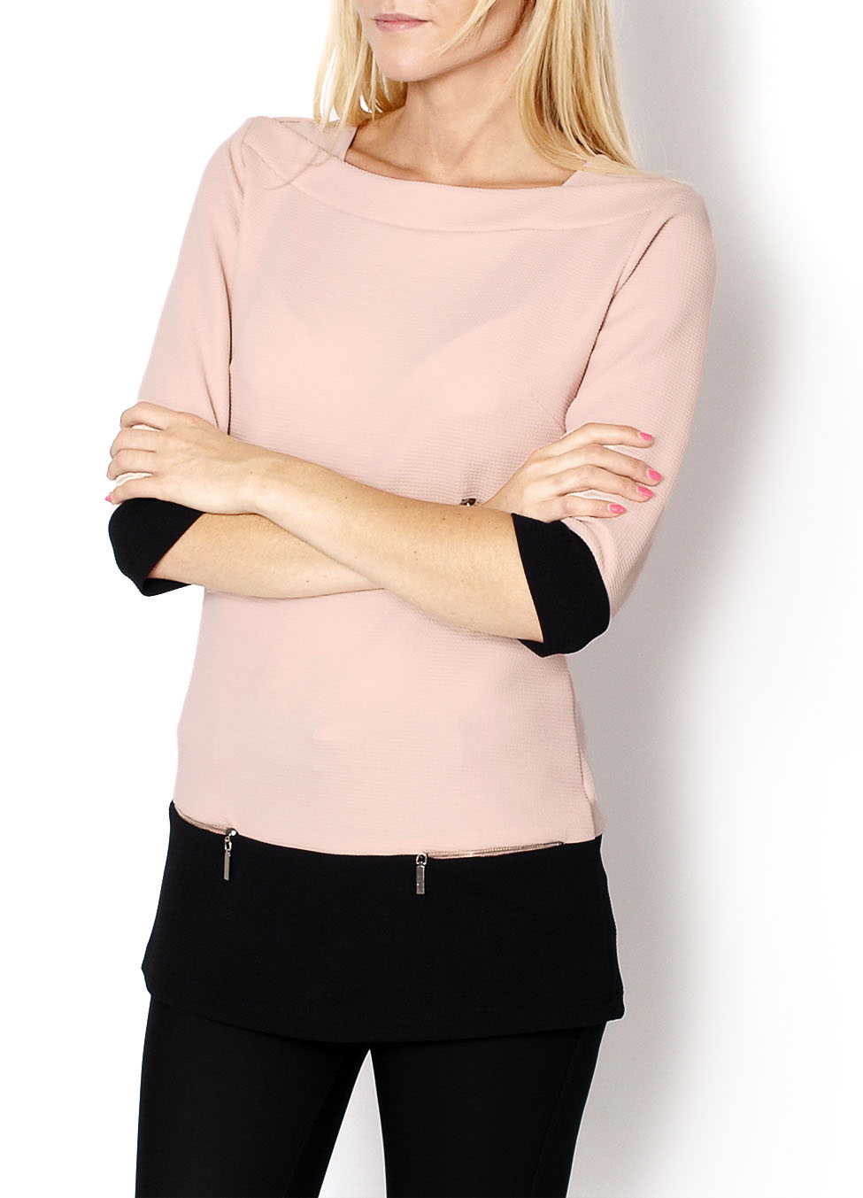 Rękawy o długości 3/4, zakończone szerokimi mankietami w kontrastowym kolorze. Dekolt łódka. Na dole ozdobne zamki w kolorze złotym. Tył zapinany na ozdobny guziczek. Bawełniany materiał o oryginalnej fakturze. Materiał 95% bawełna, 5% lycraModelka wzrost 175cm, na co dzień nosi rozmiar S/M