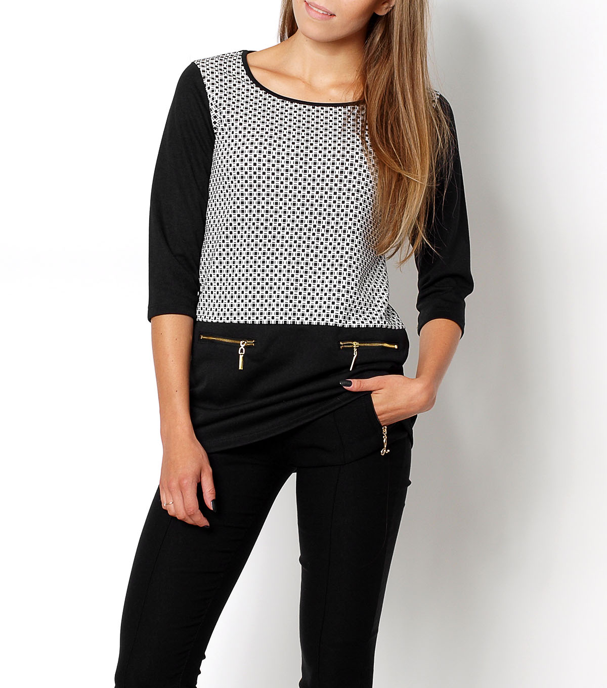 Elegancka tunika, drobna kratka, rękawy, dół i plecy w czarnym kolorze, rękaw 3/4, z przodu dwa złote zamki imitujące kieszenie, dekolt okrągły. Materiał 95% bawełna, 5% lycra.Modelka wzrost 172cm, na co dzień nosi S/M, rozmiar z prezentacji produktu M