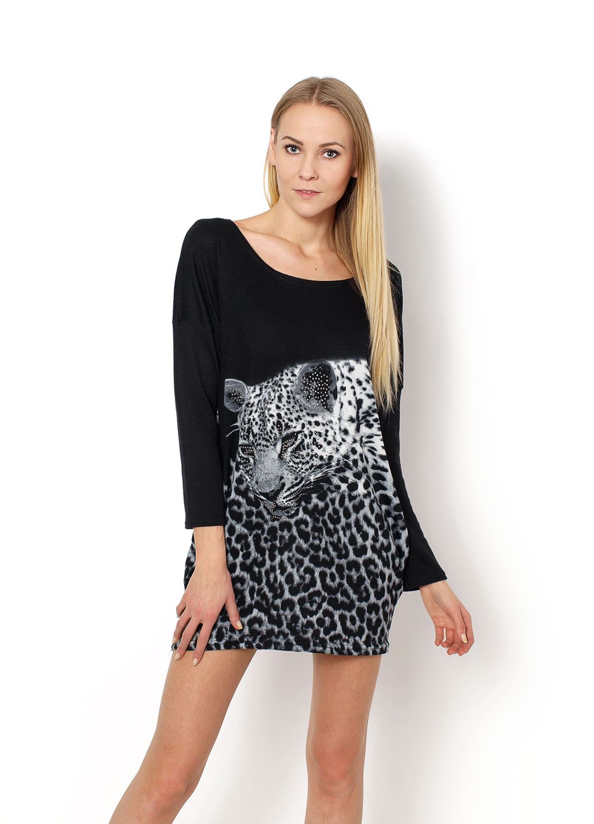 Tunika oversize, dekolt okrągły, długi rękaw, print z motywem zwierzęcym ozdobiony dżetami, po bokach marszczenia, luźny fason.Materiał 65% bawełna, 35% poliester.Modelka wzrost 175cm, na co dzień nosi S/M, rozmiar z prezentacji produktu uniwersalny.