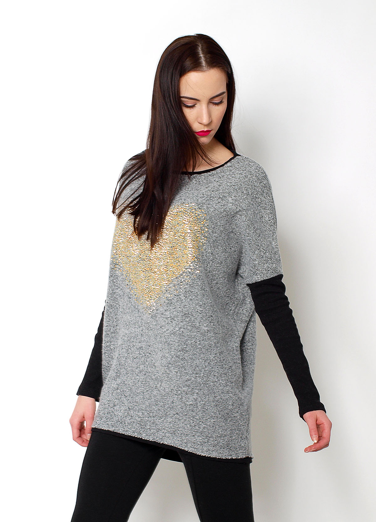 Tunika, fason oversize, z przodu serce z lśniącymi, drobnymi dżetami, asymetryczny, tył lekko dłuższy, rękawy czarne w formie ściągaczy, dół i dekolt zakończone czarną lamówką. Materiał 95% bawełna, 5% elastan.Modelka wzrost 175cm, na co dzień nosi S/M, rozmiar z prezentacji produktu uniwersalny.