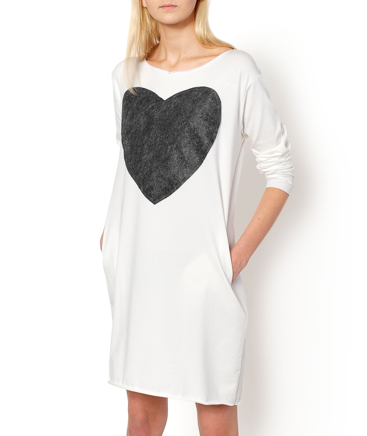 Tunika/sukienka, fason tuba, aplikacja serce, surowe wykończenie,po bokach kieszenie.Materiał 90% wiskoza, 10% elastan.Modelka wzrost 177cm, na co dzień nosi XS, rozmiar z prezentacji produktu uniwersalny