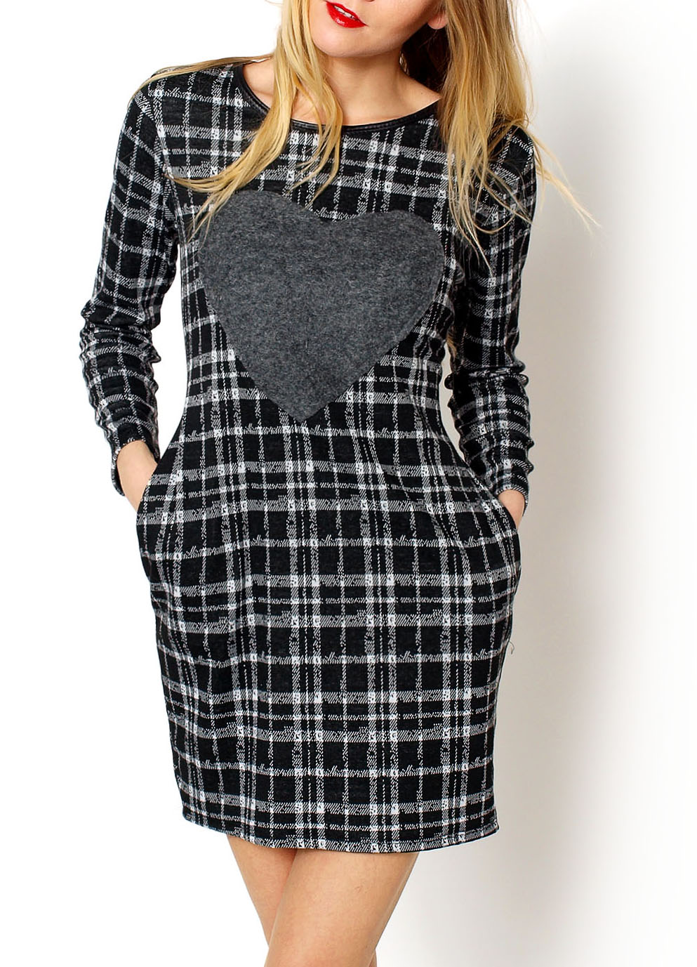 Tunika, fason tuba - szerszy w biodrach, wzór w kratkę, z przodu aplikacja serce, rękaw długi, dekolt okrągły z lamówką z ekoskóry, po bokach kieszenie wsuwane.Materiał 95% poliester, 5% elastanModelka wzrost 175cm, na co dzień nosi S/M, rozmiar z prezentacji produktu uniwersalny