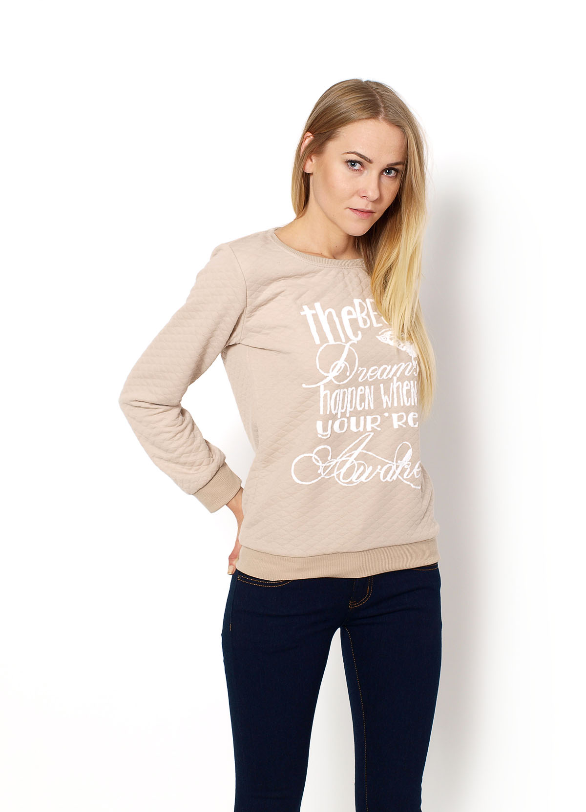 Pikowana bluza z nadrukiem w kontrastowym kolorze, rękaw długi, dekolt okrągły, rękawy i dół wykończone ściągaczem.Materiał 65% bawełna, 35% poliesterModelka wzrost 175cm, na co dzień nosi S/M, rozmiar z prezentacji produktu S/]M