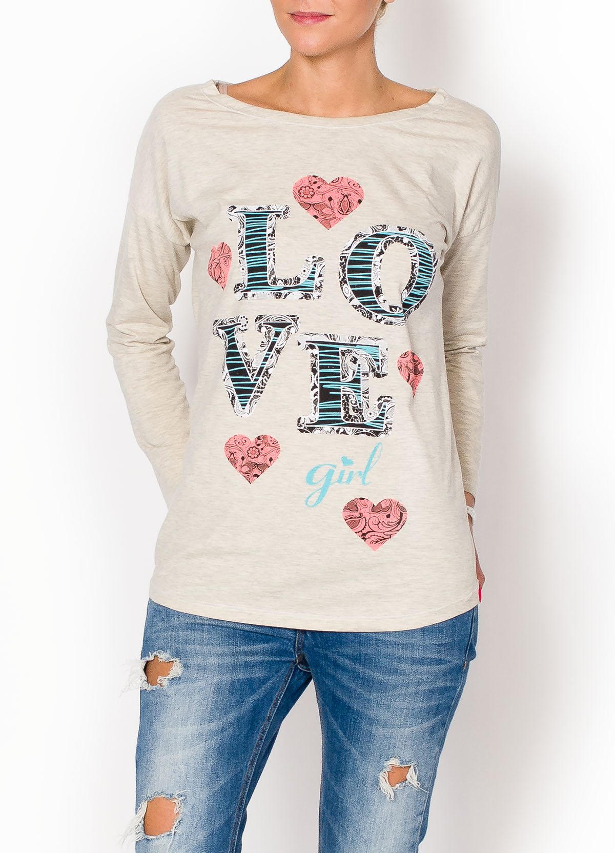 Wygodna bluzka damska z nadrukiem. Oversizowy, luźny fason zapewniający komfort i swobodę ruchów oraz mięciutki w dotyku, przyjemny dla ciała materiał. Długie rękawy, po pachami luźniejsza. Dekolt okrągły.Oryginalny nadruk nadaje wyjątkowego wyglądu, a modne kolory ożywią i nadadzą świeżości każdej stylizacji. Kolorowe printy na ubraniach stanowią jeden z głównych trendów w codziennej garderobie. Wygodna i praktyczna, modny luźny styl do miejskich stylizacji. Dobrze komponuje się z jeansami i innymi spodniami. Produkt turecki dobrej jakości.Modelka wzrost 175cm, na co dzień nosi rozmiar S/M