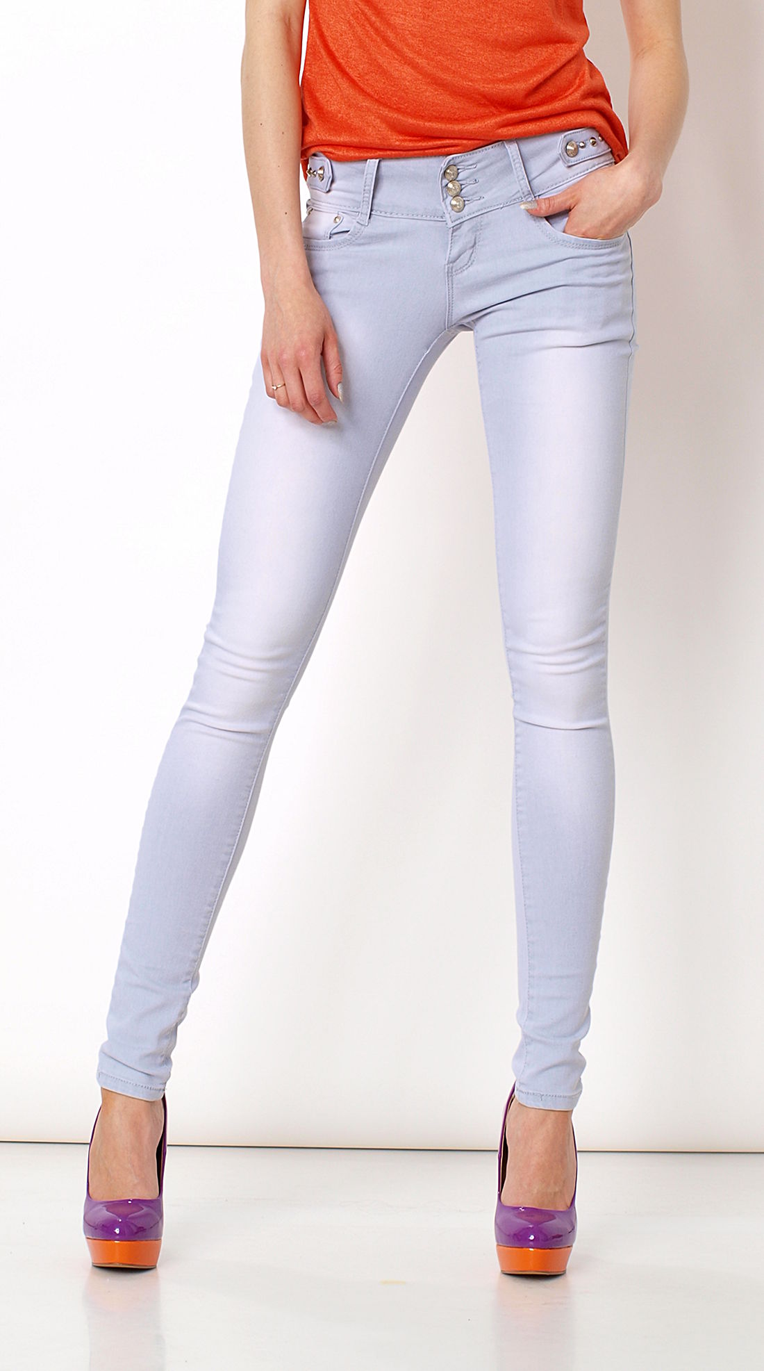 Dopasowane jeansy w ciekawym szarym odcieniu. Przecierane rurki zapinane na zamek oraz trzy oryginalne butony. Kieszenie z przodu i z tyłu wykończone nitami. W pasie szerokie szlufki oraz ozdobny pasek, który można z powodzeniem odpiąć i zastąpić innym. Spodnie rewelacyjnie prezentują się na sylwetce, ładnie podkreślają kobiece kształty. Wygodne i bardzo praktyczne. Świetne do szpilek, jak również do sportowych stylizacji.Skład: 95% bawełna, 5% elastan.Wzrost modelki: 172cmModelka ma na sobie: rozmiar z metki 38Na co dzień nosi rozmiar: S/M