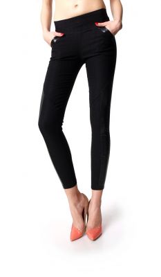 Wyszczuplające spodnie typu rurki. Rewelacyjne, elastyczne spodnie, idealnie dopasowujące się do figury. Na nogawkach modne wstawki a`la skóra. Z przodu kieszenie, (z tyłu imitacje kieszeni). W pasie na szerokiej gumce. Świetnie wysmuklają sylwetkę. Wygodne zupełnie jak legginsy.