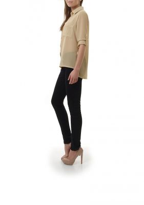 Wyjątkowa szyfonowa koszula z kołnierzykiem. Półprzezroczysta mgiełka zapinana na złote guziki. Kieszenie z przodu, na wysokości piersi. Rękawy zakończone wąskimi mankietami. Możliwość ich podwinięcia. Tył koszuli delikatnie dłuższy. Bardzo modny w tym sezonie model. Idealny, elegancki dodatek dla urozmaicenia każdej kobiecej garderoby. Dostępna w kolorze czarnym, oraz pięknych pastelowych odcieniach.Skład: 100% poliester