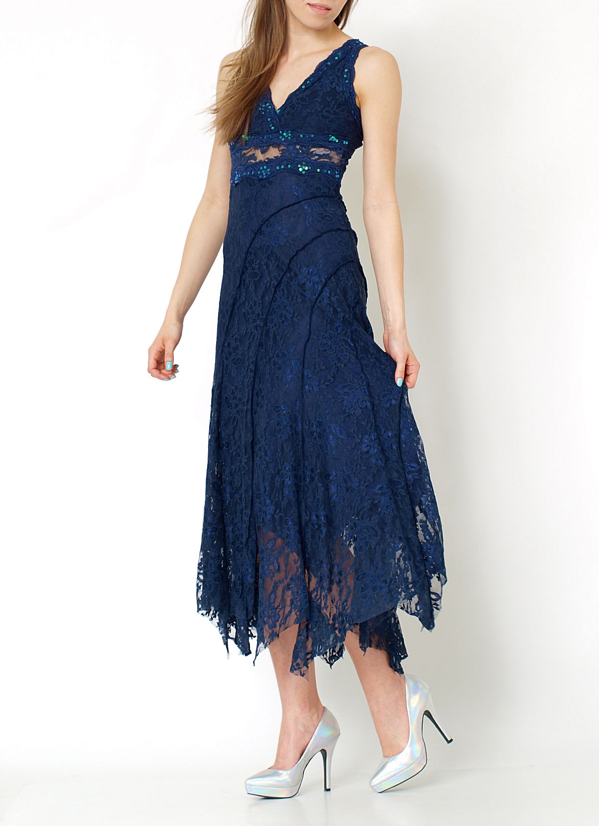 Wyjątkowa, romantyczna sukienka o niepowtarzalnym kroju. Stylowa wieczorowa suknia wykonana ze zmysłowej koronki o przepięknym kwiatowym wzorze, połączona z połyskującymi cekinami. Sukienka posiada podszewkę, spod której bielizna nie będzie widoczna. Na dole surowo wykończona asymetrycznym cięciem. Góra subtelnie podkreśla figurę, idealnie do niej przylegając. Dół delikatnie rozkloszowany, z przeszyciami. Pod biustem seksownie prześwitująca wstawka. Na plecach rozcięcie oraz zapięcie na guziczek. Wspaniała propozycja dla kobiet ceniących elegancję i niepowtarzalny styl. Świetnie sprawdzi się podczas ważnych uroczystości takich jak wesela, bale,itp.Skład: 92% poliester, 8% elastan.