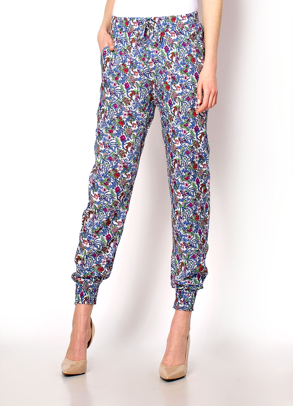 Zwiewne spodnie, fason alladynki, różne modele floral, w pasie gumka oraz sznurek do regulacji, z przodu kieszenie, nogawki wykończone ściągaczem. Materiał 100% bawełna Modelka wzrost 175cm, na co dzień nosi S/M, rozmiar z prezentacji produktu M/L